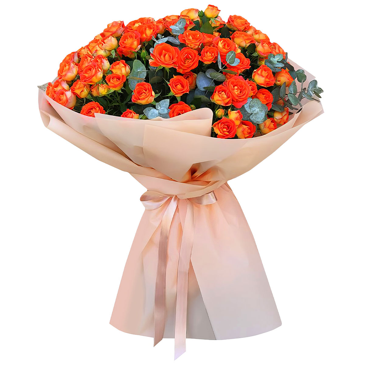 Роза кустовая оранжевая, эвкалипт. Упаковка (лента, пленка, крафт, сетка, пленка матовая)