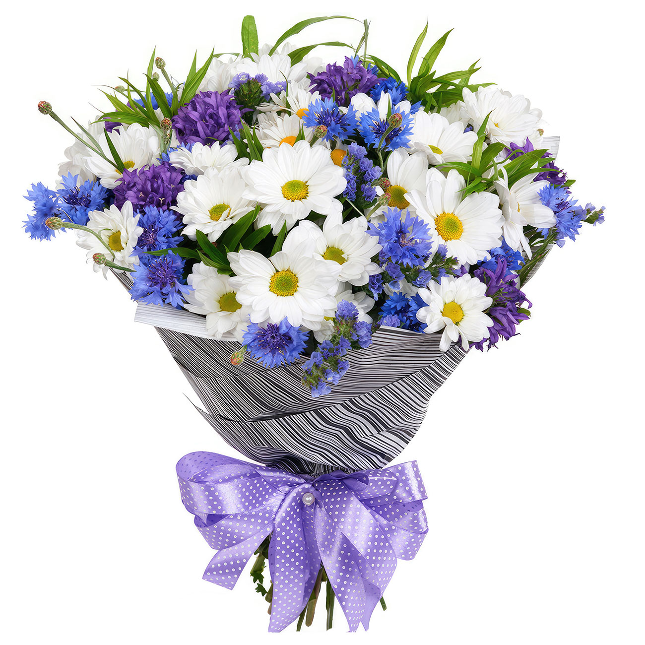 Васильки, ромашка, зелень. Упаковка (лента, пленка, крафт, сетка, пленка матовая)