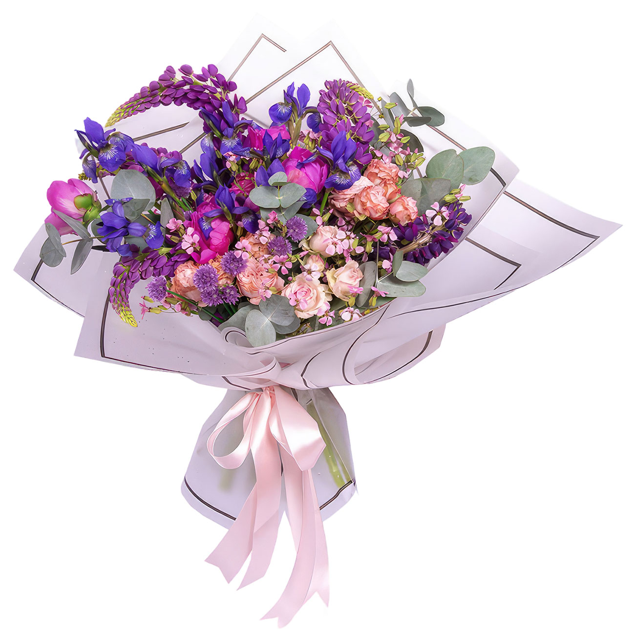 Роза кустовая розовая, люпин фиолетовый, ирис синий, пион розовый, эвкалипт. Упаковка (лента, пленка, крафт, сетка, пленка матовая)