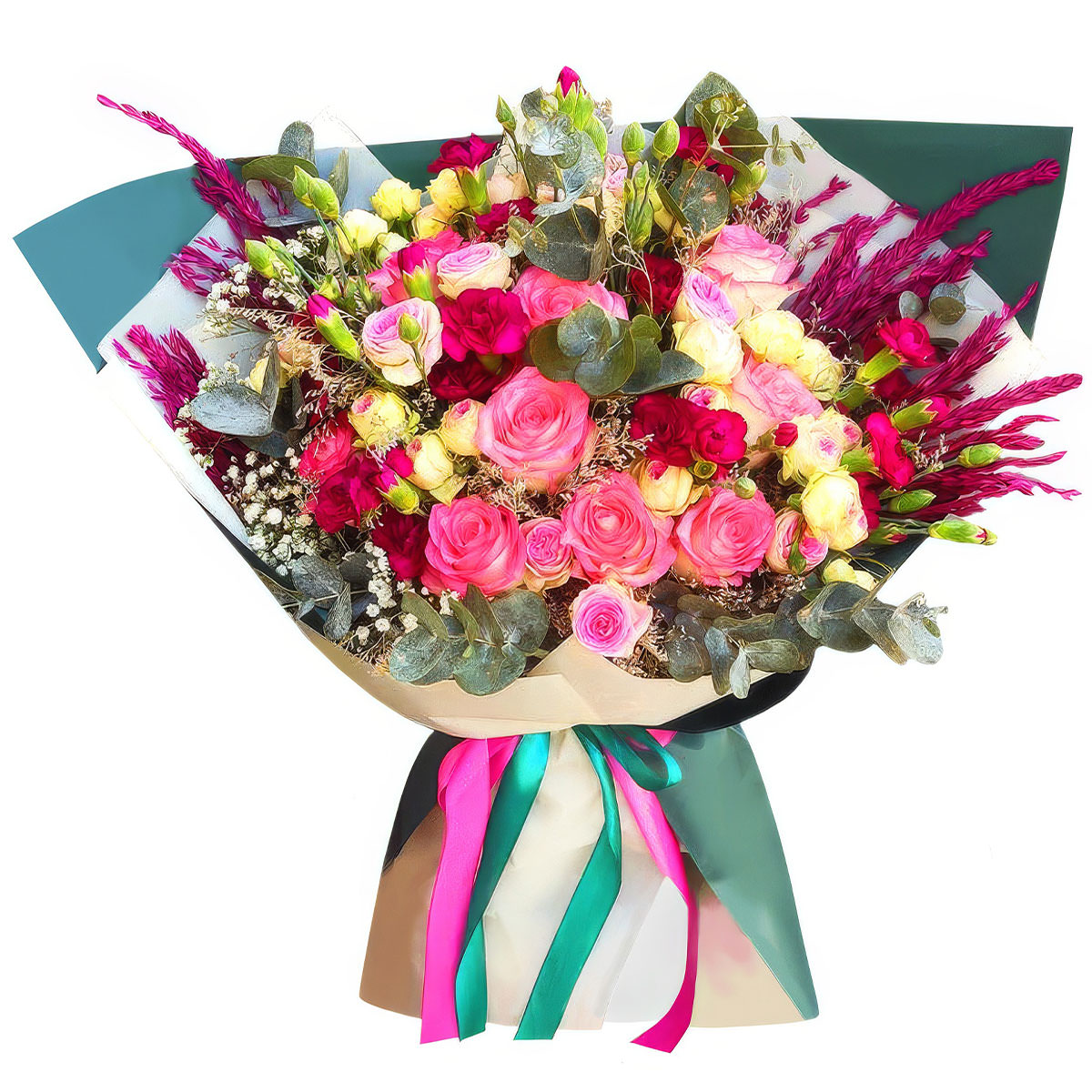 | Состав | Гипсофила, Кустовые розы, Пионовидные розы, Розы, Сухоцветы, Эвкалипт, Эустомы |