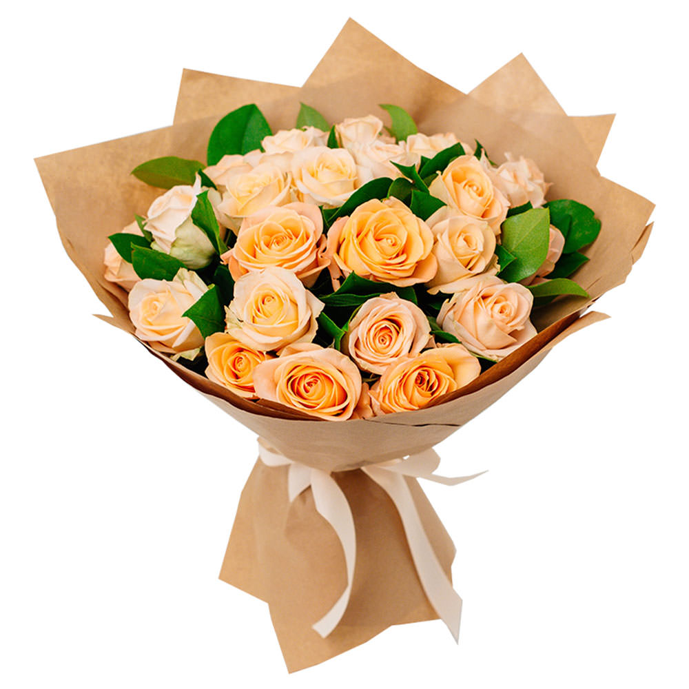 Роза одноголовая персиковая, зелень. Упаковка (лента, пленка, крафт, сетка, пленка матовая)