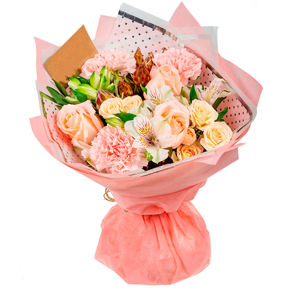 Роза одноголовая розовая, роза кустовая кремовая, альстромерия белая, гвоздика розовая. Упаковка (лента, пленка, крафт, сетка, пленка матовая)