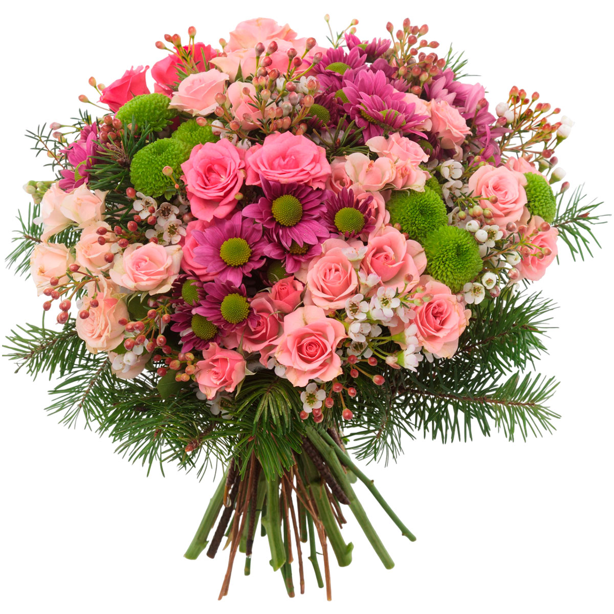 Роза кустовая розовая, хризантема кустовая розовая и зеленая, ваксфлауэр, гиперикум, пихта. Упаковка (лента, пленка, крафт, сетка, пленка матовая)