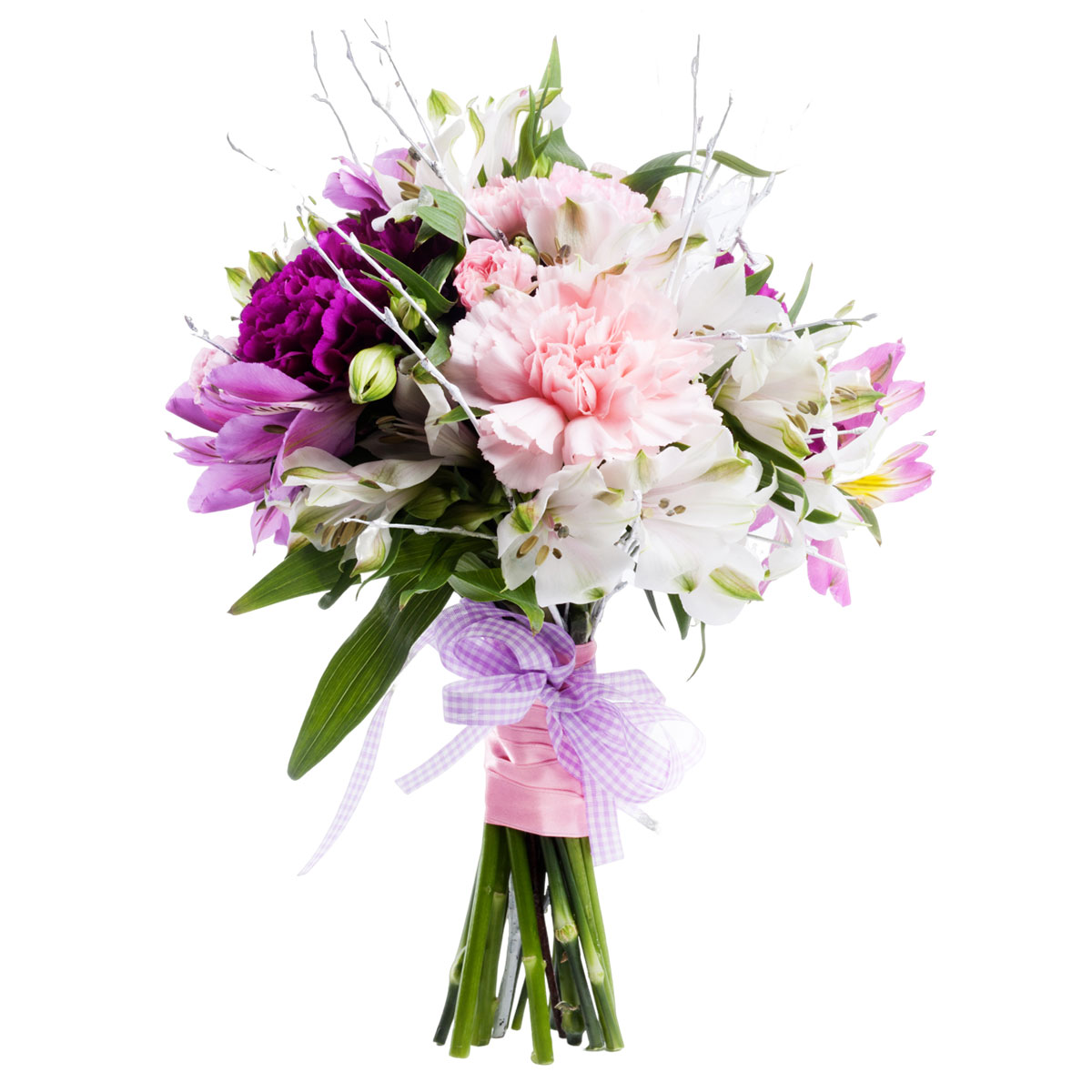 Гвоздика розовая и фиолетовая, альстромерия белая и фиолетовая. Упаковка (лента, пленка, крафт, сетка, пленка матовая)