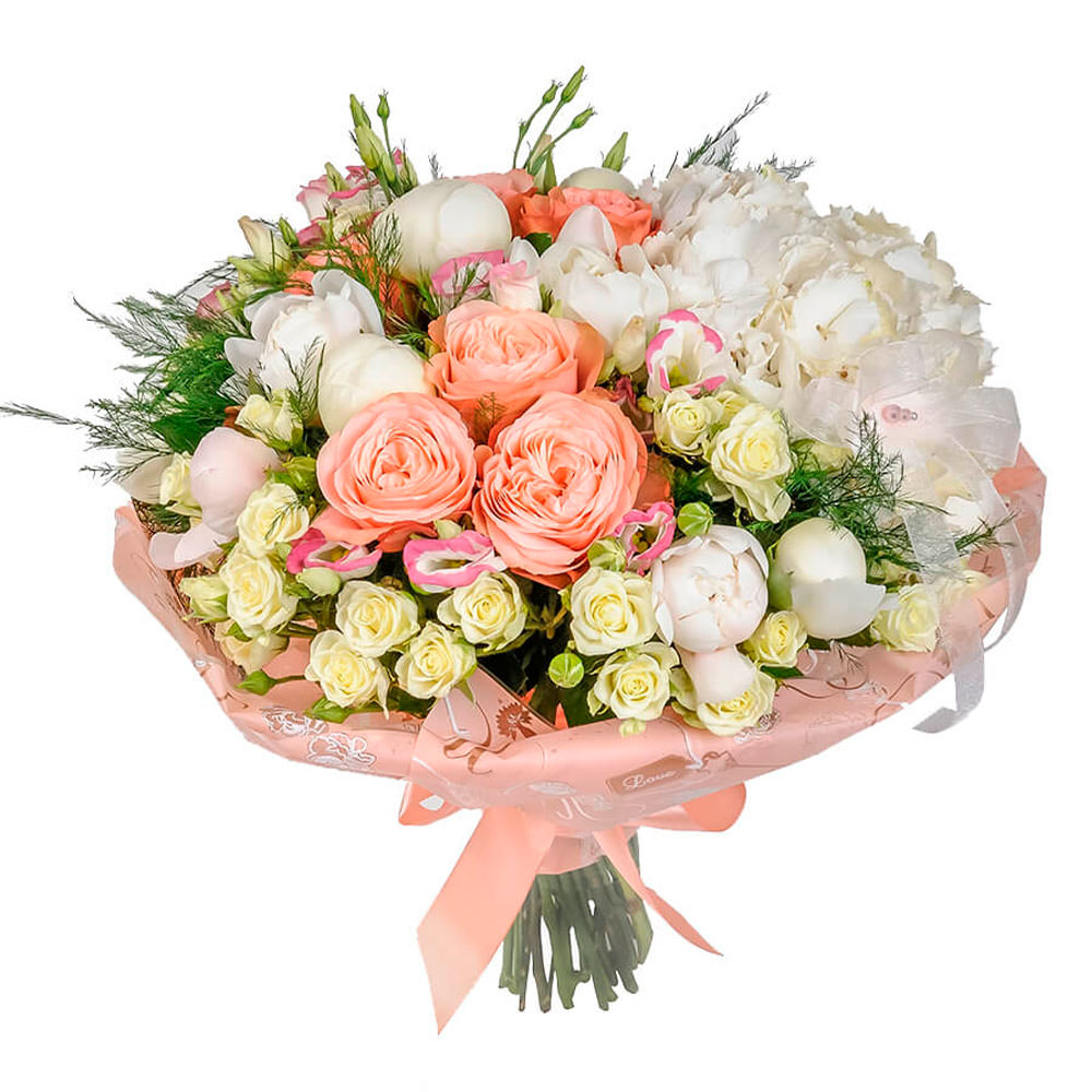 Роза кустовая кремовая, роза пионовидная персиковая, пион белый, гортензия белая, эустома розовая. Упаковка (лента, пленка, крафт, сетка, пленка матовая)