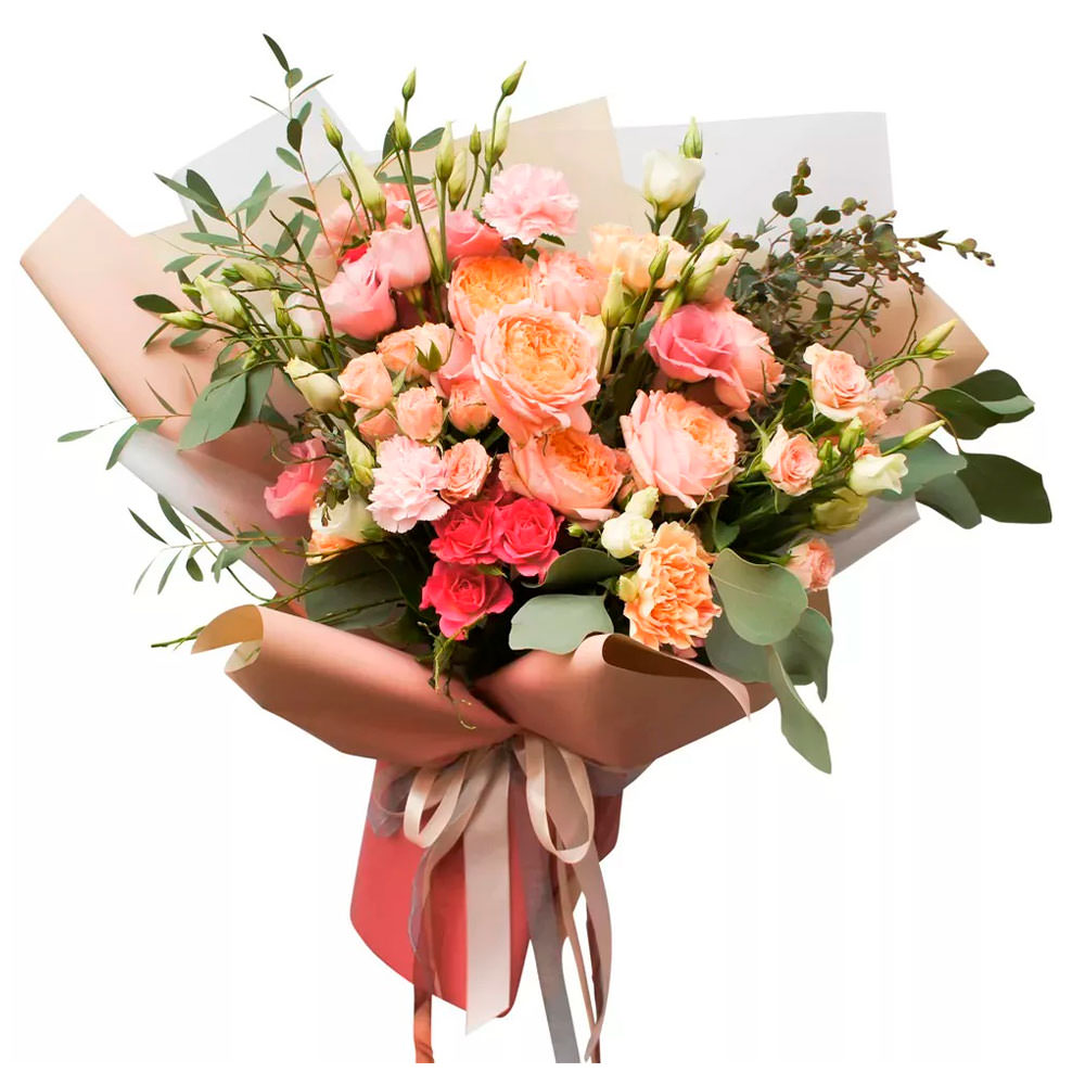 Роза кустовая пионовидная розовая, роза кустовая ярко-розовая, эустома белая, гвоздика кремовая, эвкалипт. Упаковка (лента, пленка, крафт, сетка, пленка матовая)