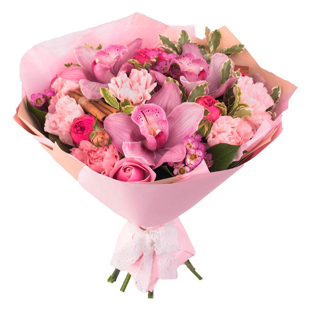 Орхидея розовая, гвоздика нежно-розовая, ваксфлауэр, пионовидная роза кустовая ярко-розовая, декоративные элементы. Упаковка (лента, пленка, крафт, сетка, пленка матовая)