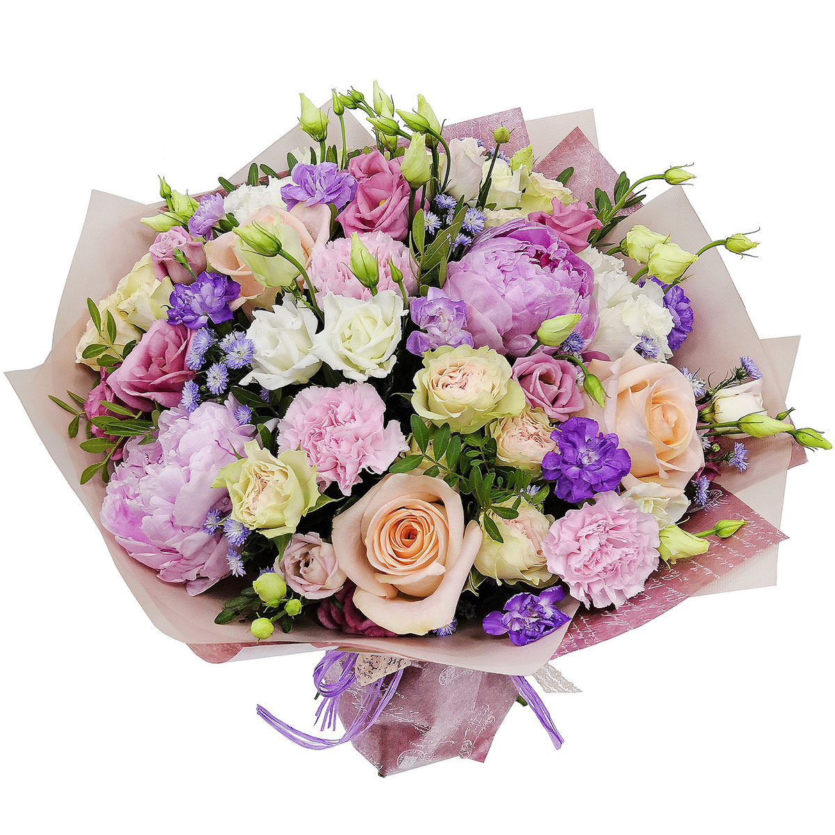 Пион розовый, роза одноголовая кремовая, эустома белая и розовая, гвоздика розовая, роза кустовая кремовая, маттиола фиолетовая, фисташка. Упаковка (лента, пленка, крафт, сетка, пленка матовая)
