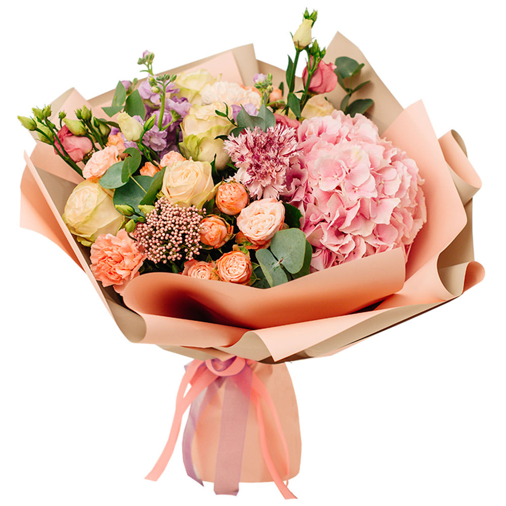 Гортензия розовая, гвоздика персиковая, роза пионовидная кустовая персиковая, роза одноголовая кремовая, гипсофилы, маттиола сиреневая, эустома кремовая, зелень, эвкалипт. Упаковка (лента, пленка, крафт, сетка, пленка матовая)