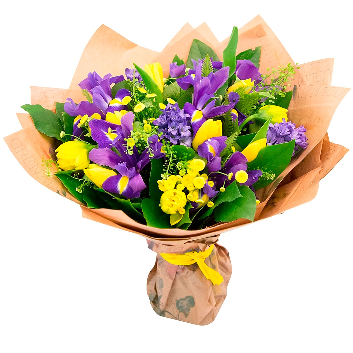 Нарцисс желтый, ирис фиолетовый, гиацинт фиолетовый, цветочный декор. Упаковка (лента, пленка, крафт, сетка, пленка матовая)