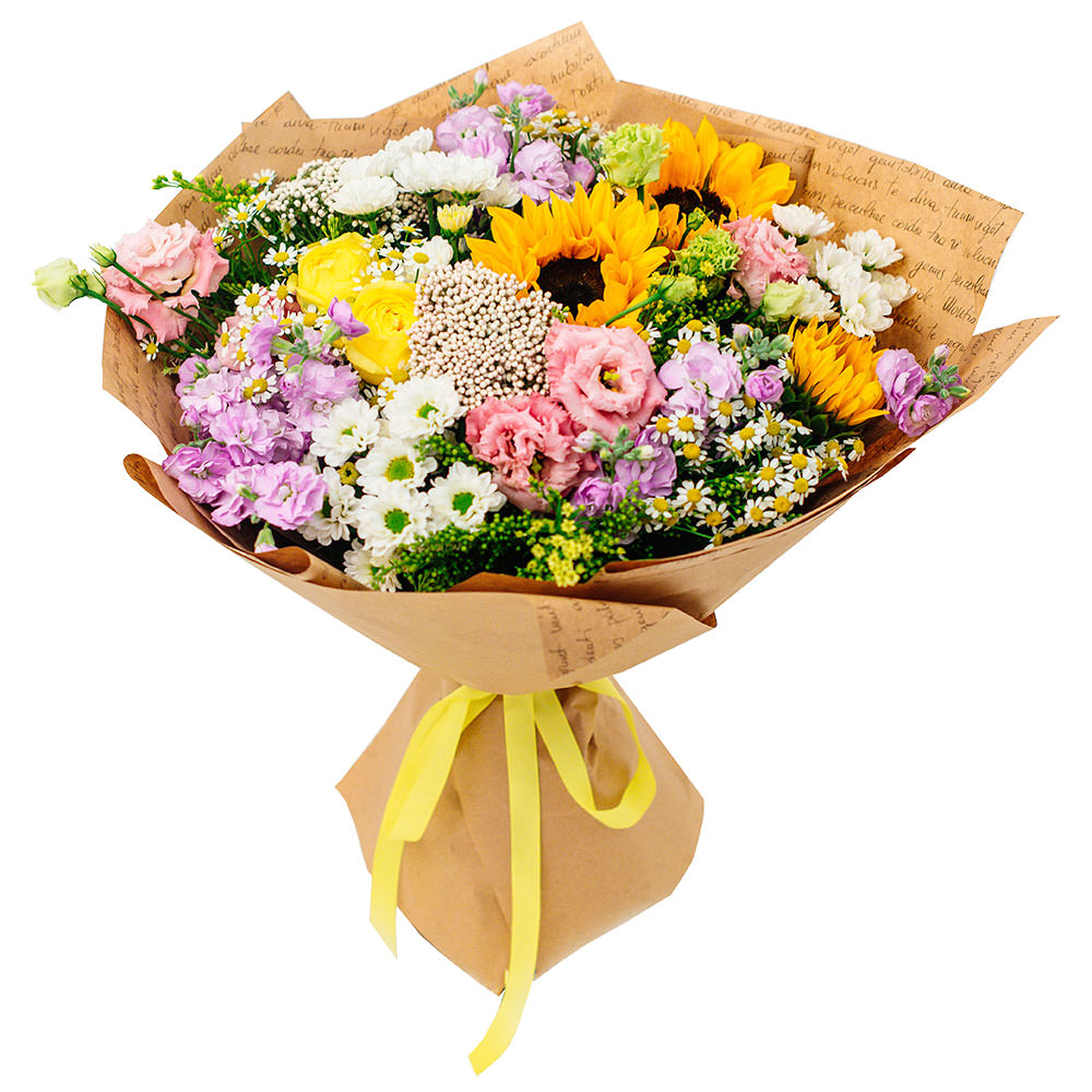 Подсолнух, эустома розовая, ромашка, озотамнус, хризантема кустовая белая, маттиола сиреневая, зелень. Упаковка (лента, пленка, крафт, сетка, пленка матовая)