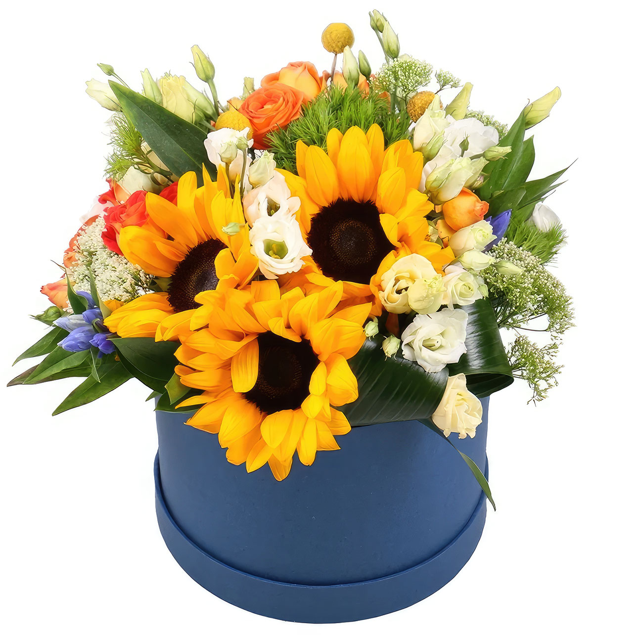 Цветы в коробке «Подсолнечное настроение» с доставкой по г Заречный: вы можете заказать букет в салоне цветов «Флормания» по цене от 3190 руб.