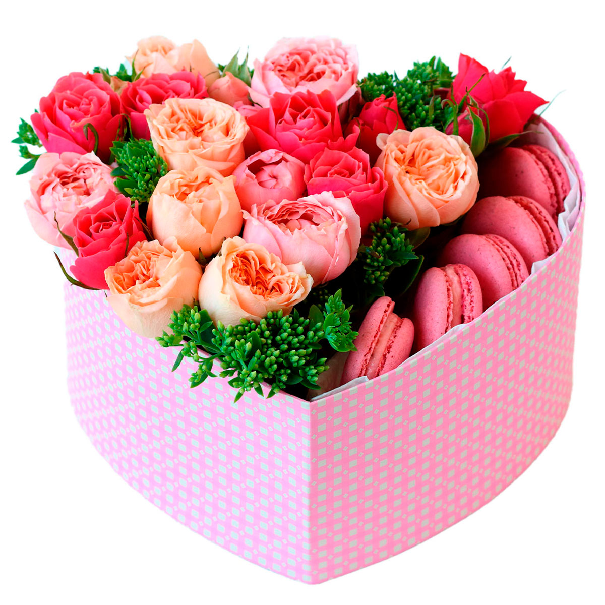 Роза пионовидная персиковая и розовая, роза одноголовая розовая, зелень, макарон. Упаковка (шляпная коробка, квадратный бокс, коробка сердце, оазис)