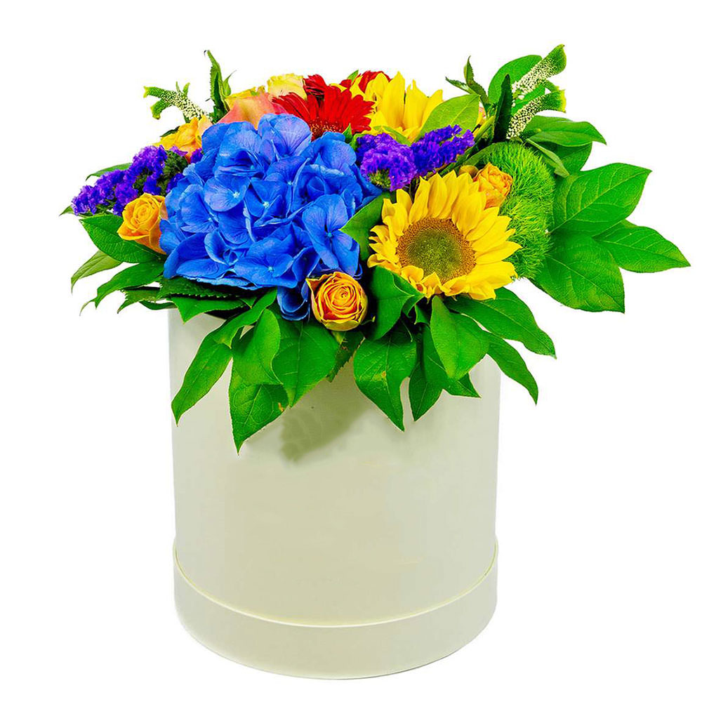 Гортензия синяя, роза кустовая желтая, подсолнух, гербера красная, статица, зелень. Упаковка (шляпная коробка, квадратный бокс, коробка сердце, оазис)