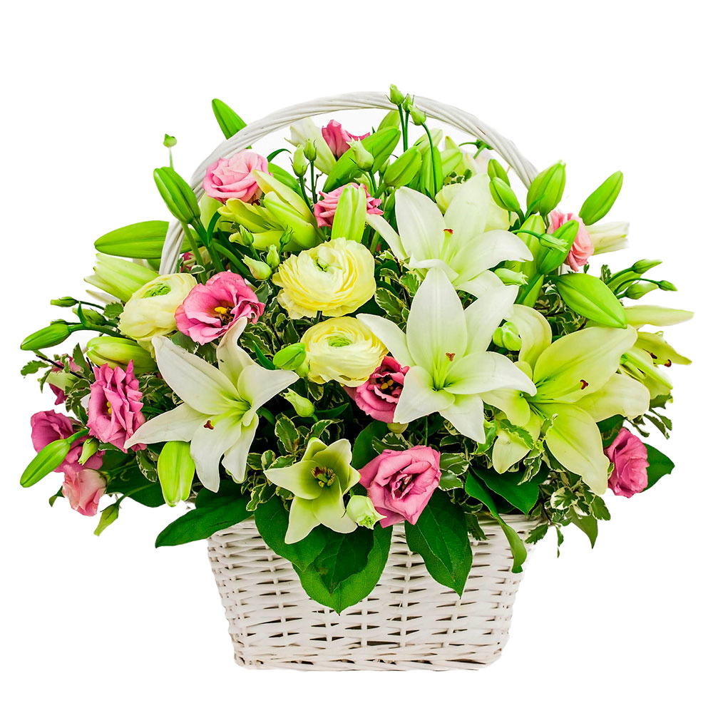 Лилия белая, ранункулюс, эустома розовая, зелень. Упаковка (Корзина, оазис).