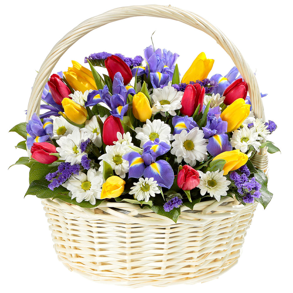 Хризантема кустовая белая, ирис, тюльпан микс (желтый, красный), статица, зелень. Упаковка (Корзина, оазис).